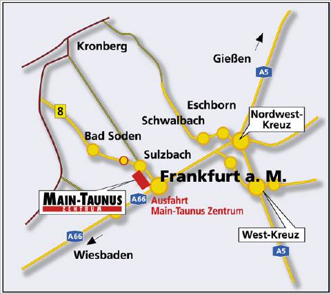 Sie erreichen uns über die A66 (Frankfurt - Wiesbaden) und die B8 (Bad Soden - Königstein Kronberg). Abfahrt: Main-Taunus-Zentrum